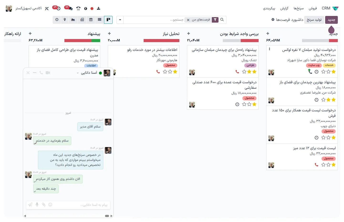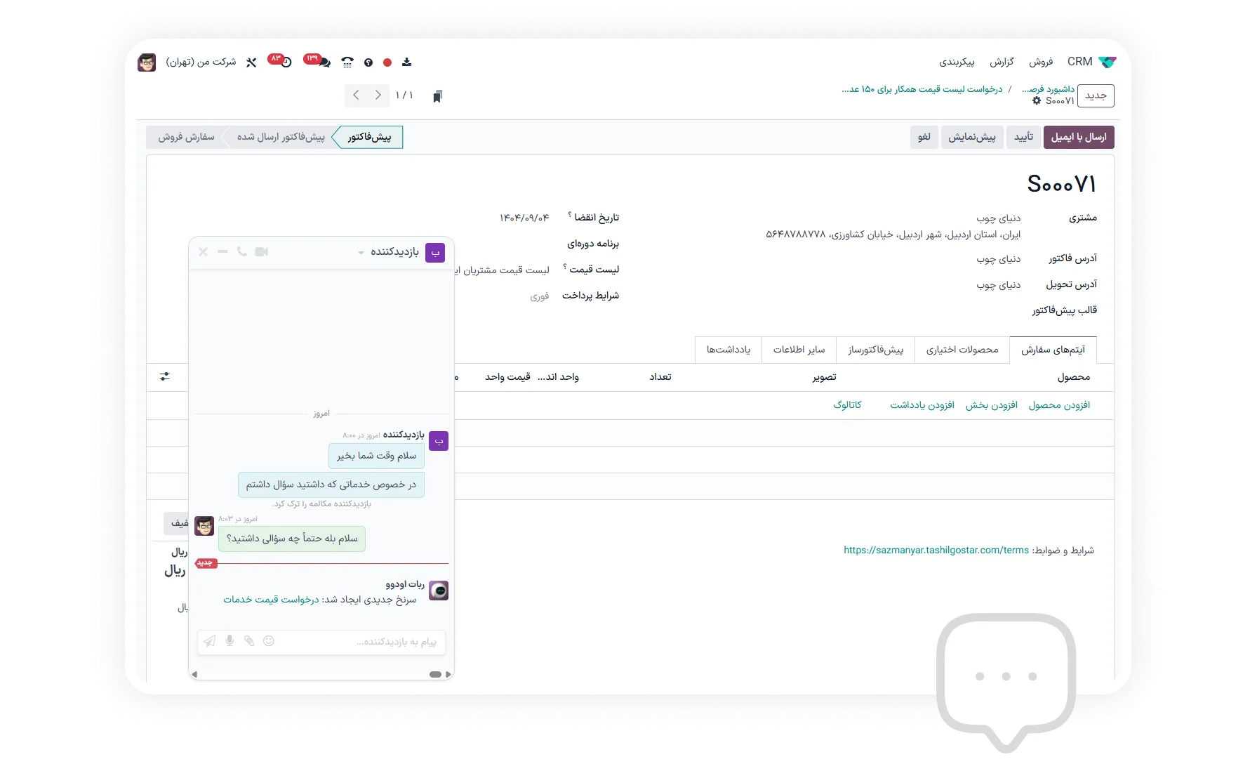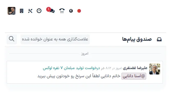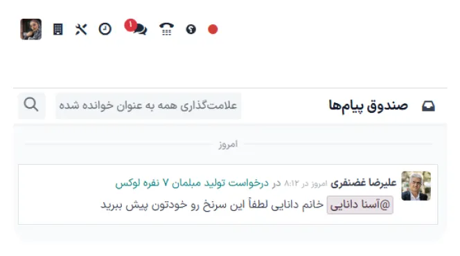می‌توانید پاسخ‌های مربوط به سفارش‌های فروش، وضعیت سفارش‌های خرید، تأیید اسناد حسابداری، و به‌روزرسانی‌های پروژه را از طریق یک صندوق پیام متمرکز مشاهده و مدیریت کنید.