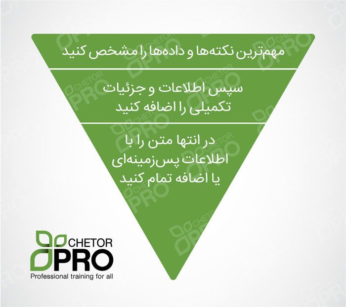 هرم وارونه روش بسیار کارآمدی برای تهیهی ایمیل است. با این روش احتمال فوران اطلاعات را در ایمیلهایتان کاهش میدهید. همچنین در تهیه گزارش هایی که باید شامل جزئیات باشند، میتوانید خلاصهی مدیریتی را بر مبنای این روش بنویسید.