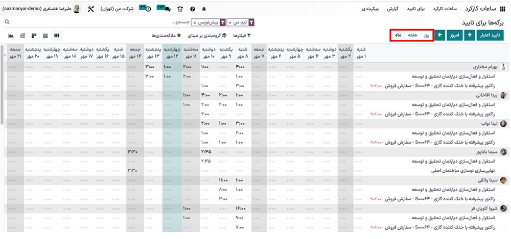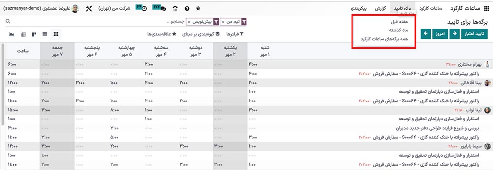 جدول زمانی اطلاعاتی را در مورد کارمند نشان میدهد، از جمله تاریخ، نام پروژه، وظیفه، شرح شغل و ساعات کار، که محاسبه بهرهوری را بهطور موثر امکانپذیر میکند. با انتخاب ستونهای ساعت زمان، میتوانید ساعتها را تغییر دهید. دادهها را میتوان بهصورت دستی با کلیک بر روی دکمه "تایید اعتبار" تأیید کرد.