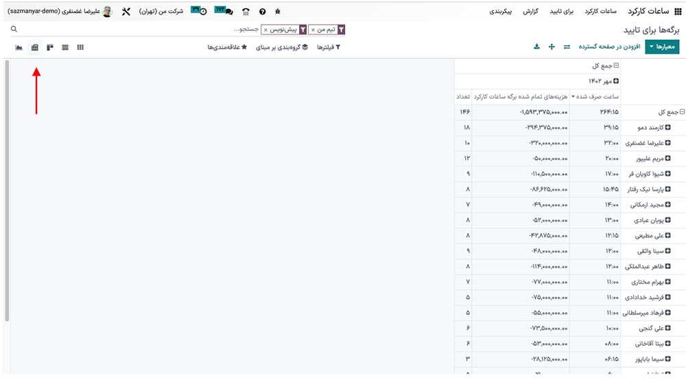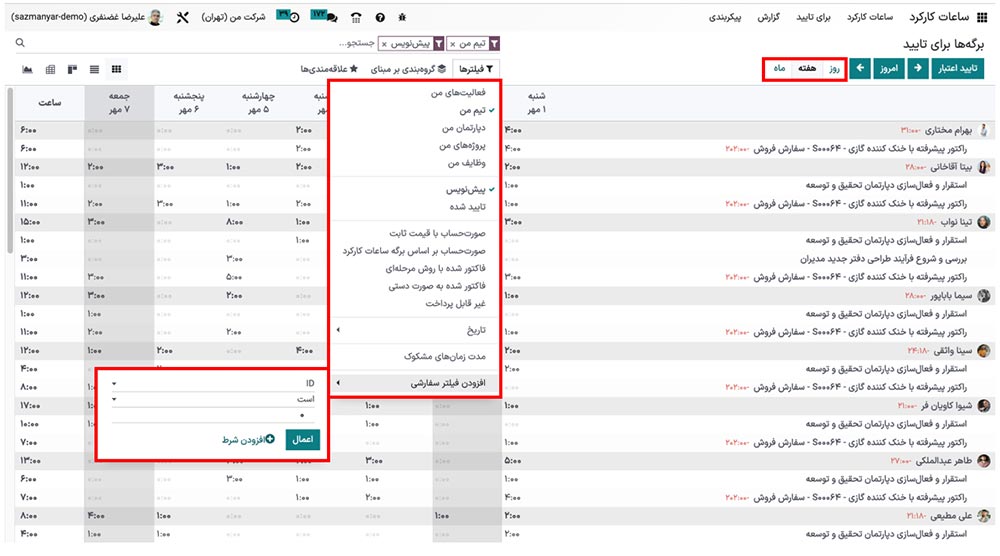 برای نمایش جدول زمانی خاص، میتوانید یک فیلتر سفارشی نیز ایجاد کنید. با استفاده از گزینه "گروهبندی بر مبنای" میتوانید برگههای زمانی را از چندین دسته، از جمله پروژه، وظیفه، تاریخ نوع قابل صورتحساب، بخش، و کارمند گروهبندی کنید. اگر روی سلول زمان کلیک کنید، ممکن است مشخصات اسناد مربوط به ساعات کاری را مشاهده کنید.