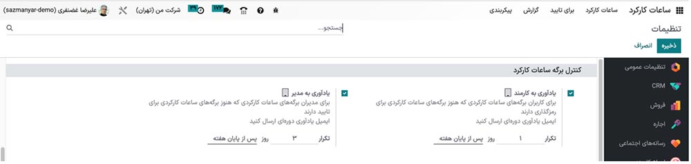 تنظیمی برای کنترل برگه ساعت کارکرد این ماژول، از منوی پیکربندی قابل دسترسی است. در این تب تنظیمات کنترل برگه ساعت کارکرد، میتوانید گزینههای “یادآوری به کارمند” و “یادآوری به مدیر” را فعال و غیرفعال کنید.