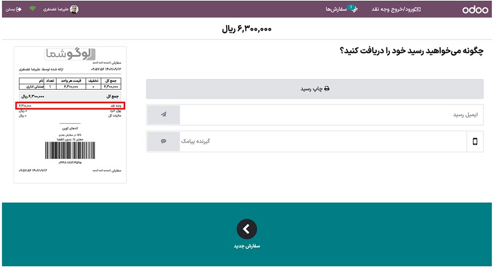 اکنون رسید نشان داده شده است. جزئیات شامل نوع پرداخت، مبلغ پرداختی، تعداد محصولات و غیره است.