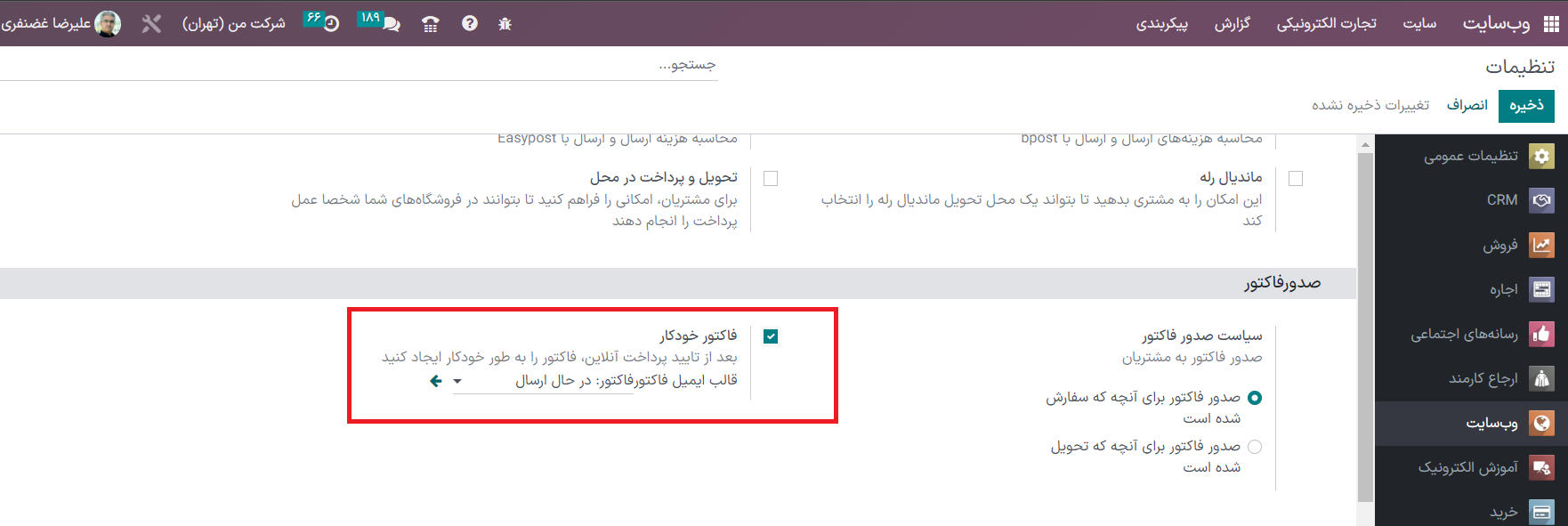 اطمینان حاصل کنید که گزینه "فاکتور خودکار" در بخش صدور فاکتور فعال باشد تا محتوا را در پایان تسویهحساب دریافت کنید.
