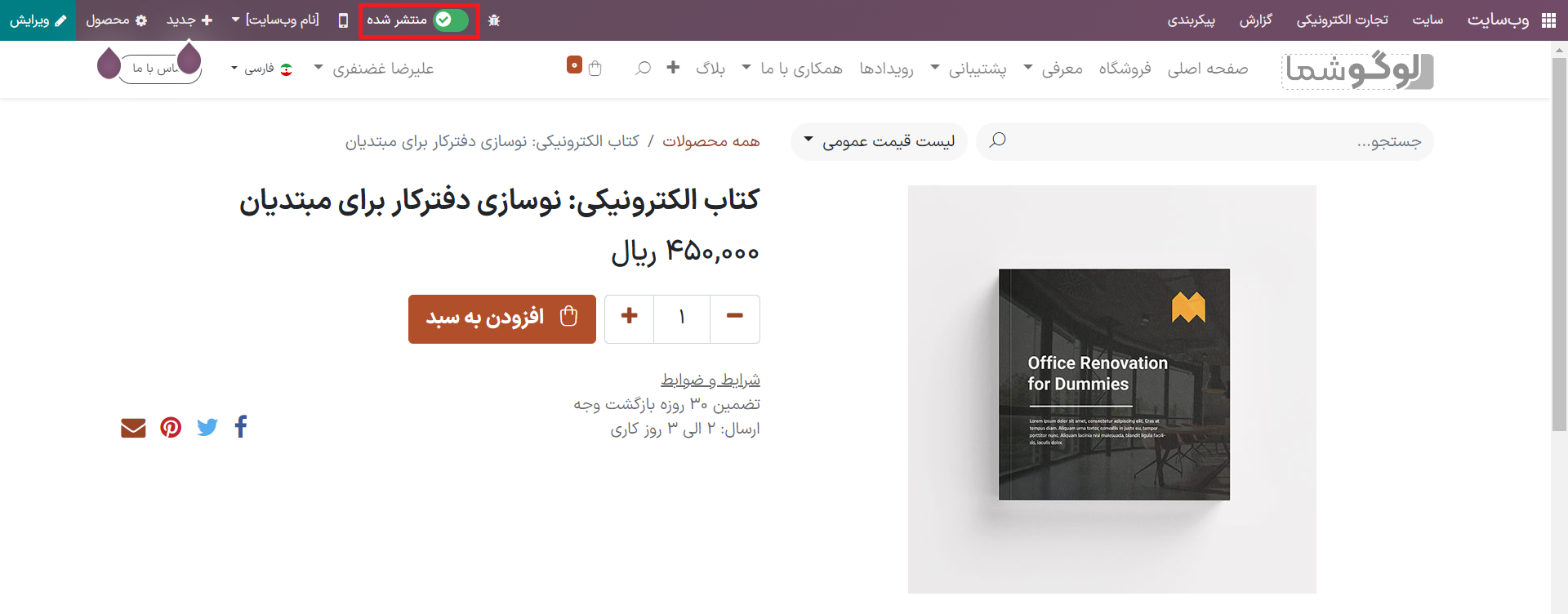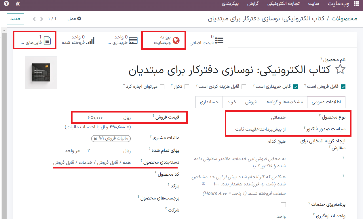 مشاهده میکنید که نوع محصول، خدماتی انتخاب شده است و میتوانید قیمت فروش را تنظیم کنید. اگر میخواهید برای محصول خود دستهبندی خاصی را مشخص کنید میتوانید از بخش "دسته بندی محصول" این کار را انجام دهید. فراموش نکنید که محصولات خود را منتشر کنید تا بتوانید از آنها در وب سایت خود استفاده کنید. با کلیک بر روی دکمه برو به وب سایت، میتوانید به راحتی به فرانتاند صفحه محصول خود از طریق وب سایت دسترسی داشته باشید.