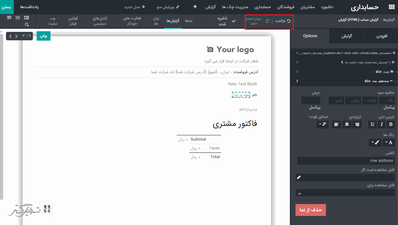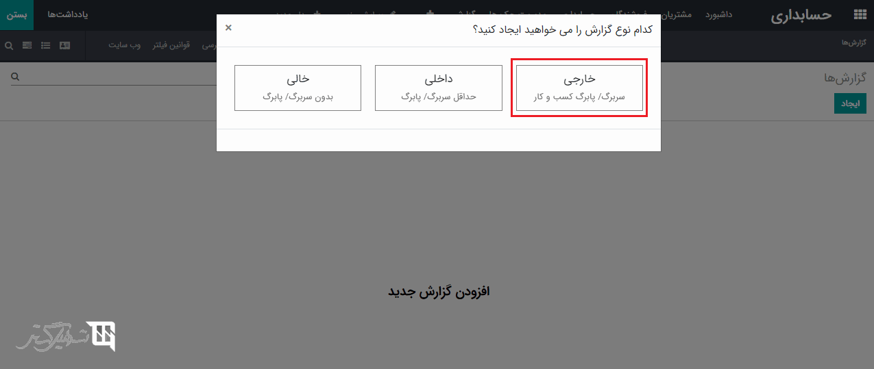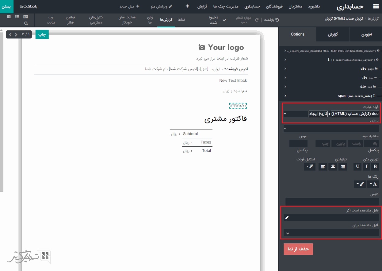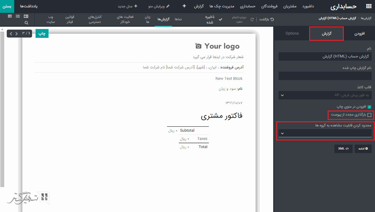در تب گزارش، فیلد محدود کردن قابلیت مشاهده به گروه ها، قابلیت مشاهده گزارش را برای گروه های خاص تنظیم می کند، به این معنی که کاربران متعلق به گروه های دیگر سند نهایی را مشاهده نمی کنند. همچنین می توانید نامی برای گزارش خود اضافه کنید و قالب کاغذ را انتخاب نمایید. اگر گزارش باید به فرم سند مربوطه در لیست منوی چاپ اضافه شود، گزینه "افزودن در منوی چاپ" را فعال نمایید.