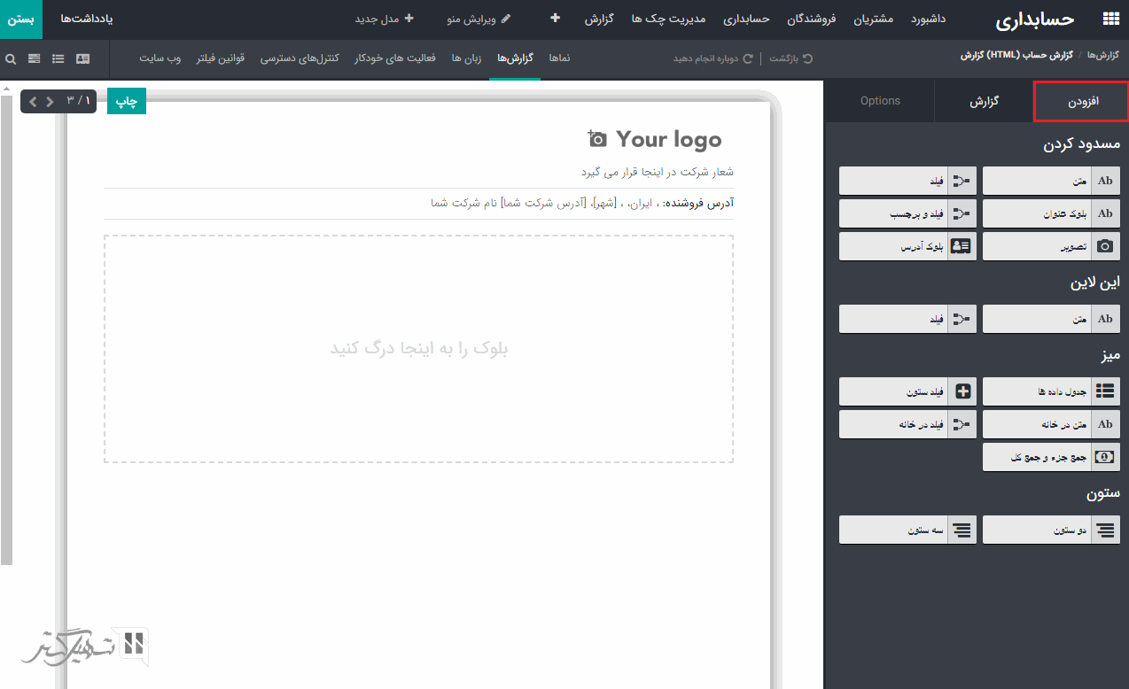 در تب افزودن، فیلدهایی مختلفی موجود است که می توانید آنها را در صفحه خود درگ و دراپ کنید. فیلدها، جداول داده ها، جمع جزء و جمع کل و بلوک آدرس عناصر پویایی هستند (به این معنی که آنها به یک شی مرتبط با one2many یا many2many نیاز دارند). متن، بلوک عنوان، تصویر و متن در خانه، اجزا ایستا هستند.