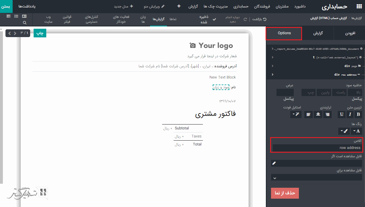 اگر حالت "توسعه دهنده" را فعال کنید، فیلدهای دیگری مانند "کلاس" در تب تنظیمات و "بارگذاری مجدد از پیوست" در تب گزارش، قابل مشاهده خواهند بود: