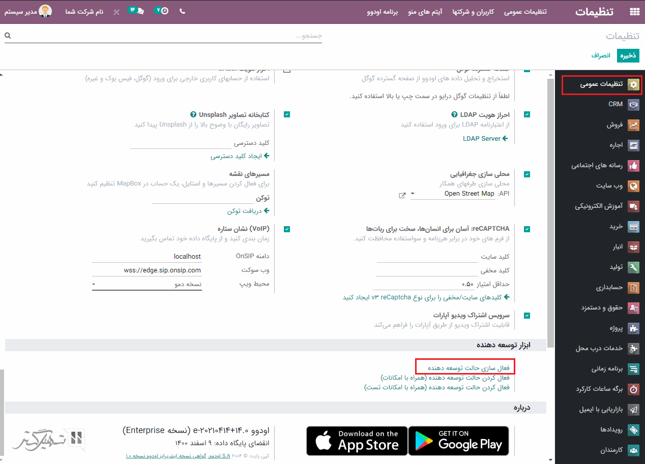 تنظیمات عمومی> تب ابزار توسعه دهنده> حالت توسعه دهنده
