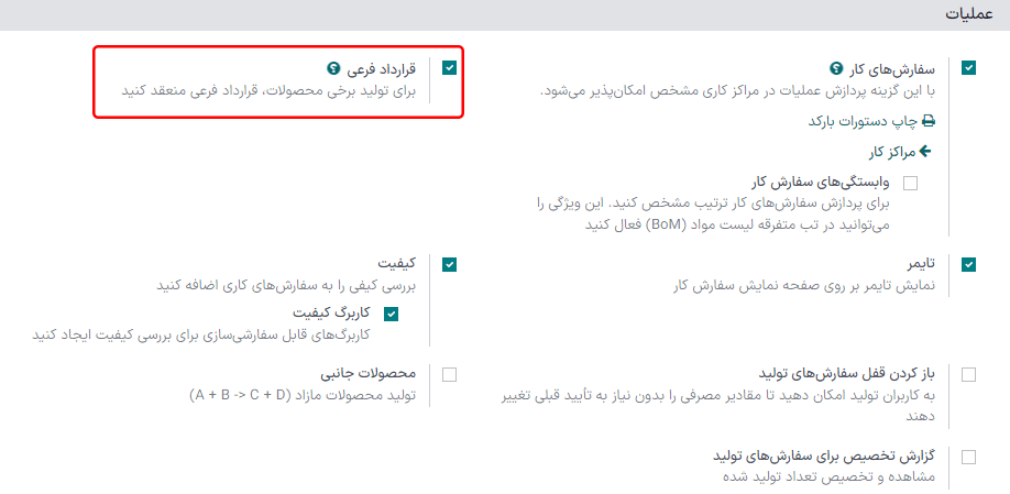 برای استفاده از ویژگی پیمانکاری فرعی وارد مسیر تولید ◄ پیکربندی ◄ تنظیمات شوید و گزینه قرارداد فرعی را فعال کنید.