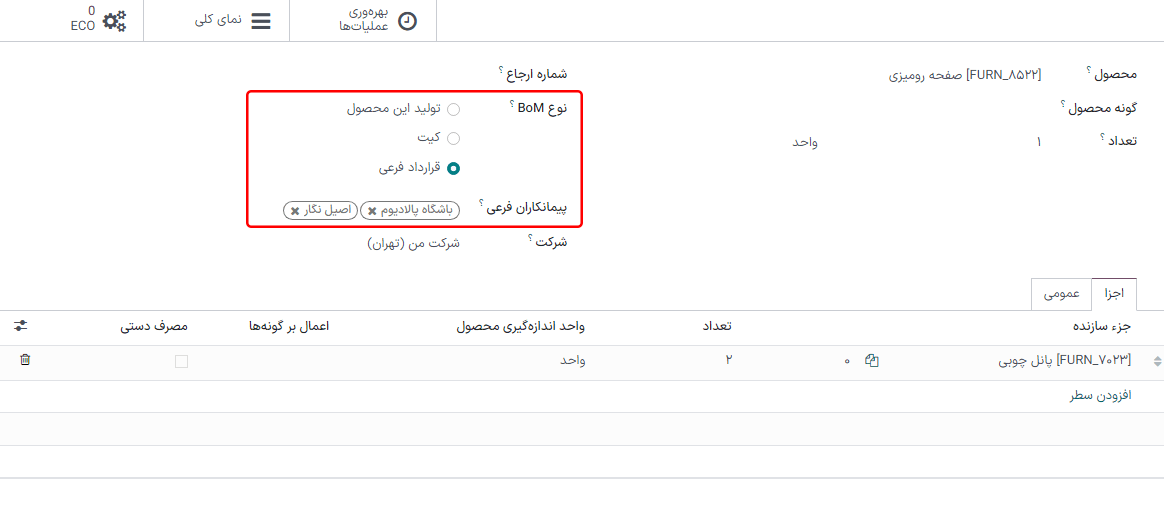 برای ایجاد BoM جدید وارد مسیر تولید ◄ محصولات ◄ لیست مواد شوید و جدید را بزنید. سپس اجزایی که پیمانکار فرعی برای تولید محصول نیاز دارد را لیست کنید. برای هزینه‌یابی همچنین می‌توانید تمام اجزا، حتی آن‌هایی که مستقیماً از پیمانکار فرعی تأمین شده‌اند را ثبت کنید.