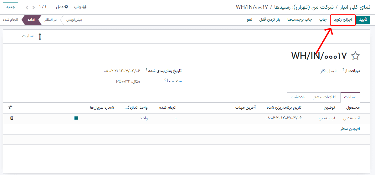 همانطور که مشاهده می‌کنید، رسید هر دو محصول رهگیری نشده را می‌توان با انتخاب گزینه تنظیم مقادیر و یا از طریق منوی کوچک سطر انتقال انجام داد.