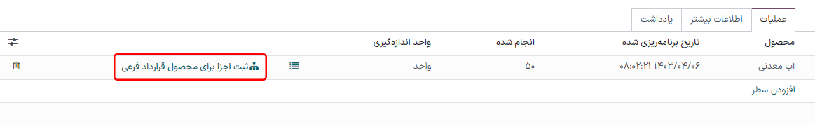 در این صورت، در رسید محصول پیمانکاری شده، دکمه اجزای رکورد نمایش داده می‌شود. بر روی آن کلیک کنید و در پنجره باز شده سری ساخت یا شماره سریال اجزا را وارد کنید. اگر محصول تمام شده نیز رهگیری می‌شود، شماره سریال و سری ساخت آن را نیز می‌توان در این قسمت ثبت کرد.
