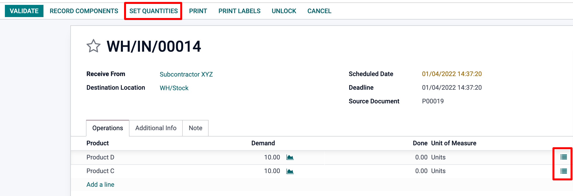 همچنین توجه داشته باشید که اگر مصرف انعطاف‌پذیر برای BoM پیمانکار فرعی شده برای محصول رهگیری نشده انتخاب شود، اجزای رکورد به صورت اختیاری در هر سطر از انتقال دیده می‌شود و با استفاده از آن می‌توانید مصرف محصولات کمتر یا بیشتر را در مکان پیمانکاری فرعی به هنگام دریافت محصول نهایی ثبت کنید.