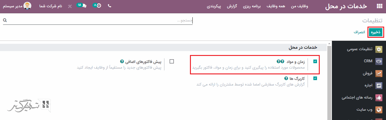 برای پیگیری محصولات استفاده شده در طول عملیات و فاکتور گرفتن زمان و مواد، به ماژول خدمات در محل> پیکربندی> تنظیمات بروید و ویژگی "زمان و مواد" را فعال کنید.