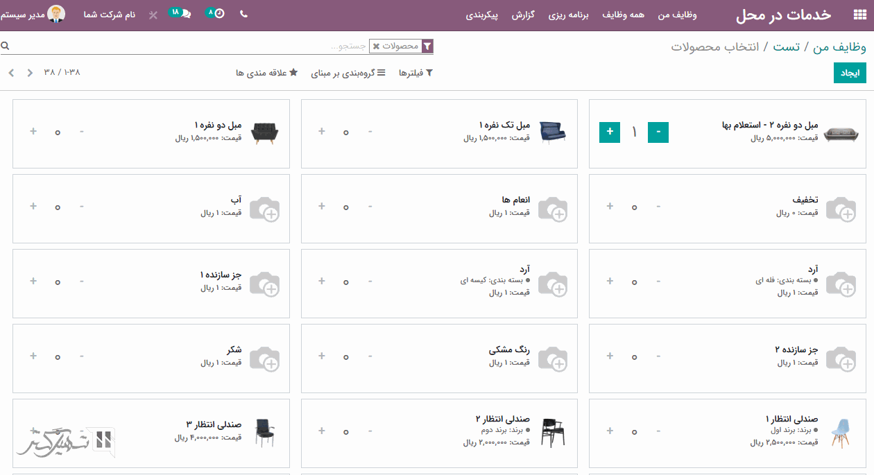 پس از فعالسازی این گزینه، یک دکمه هوشمند با عنوان "محصولات" در فرم وظایف ظاهر خواهد شد. با کلیک بر روی آن می توانید مواد مورد نیاز برای تکمیل وظیفه را اضافه نمایید: