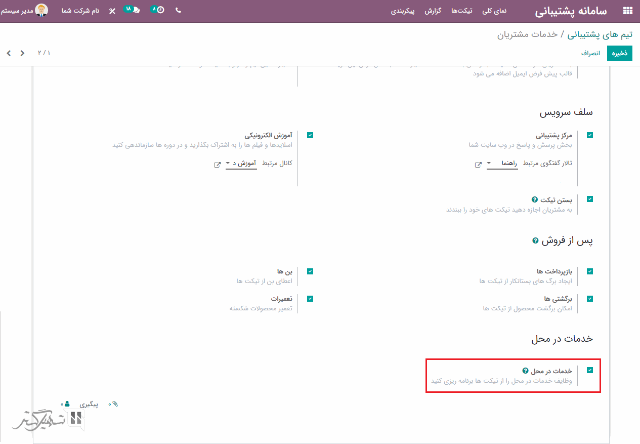 از "نوآوری های داخلی سایت" از طریق سامانه پشتیبانی برای زمانبندی تیکت خدمات در محل استفاده خواهد شد. ویژگی خدمات در محل را از طریق ماژول سامانه پشتیبانی> پیکربندی> تیم های پشتیبانی ، فعال کنید تا از این پس بتوانید وظایف خدمات در محل را از طریق تیکیت ها برنامه ریزی کنید.
