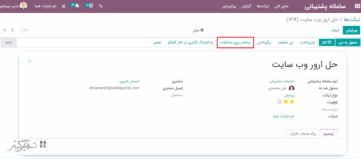 اکنون هنگام ایجاد تیکت، یک دکمه "برنامه ریزی مداخلات" برای برنامه ریزی خدمات در محل ظاهر خواهد شد: