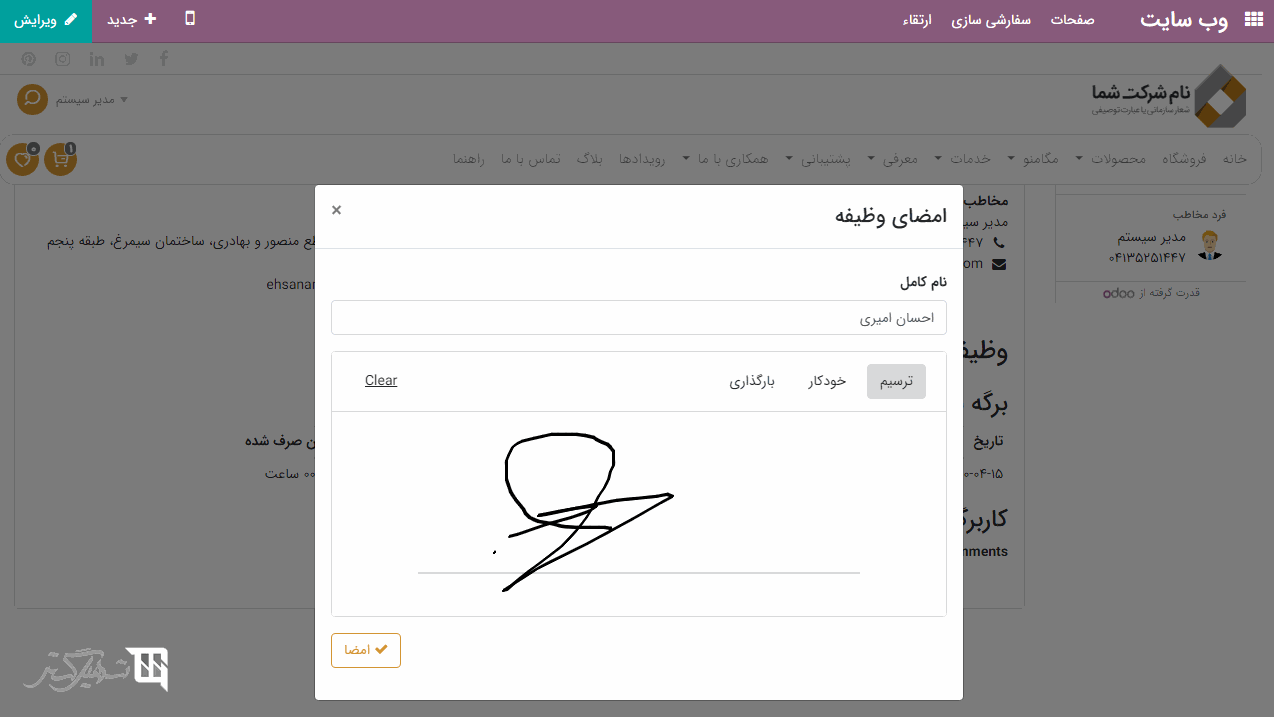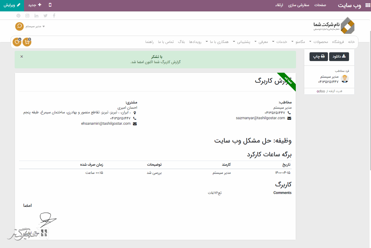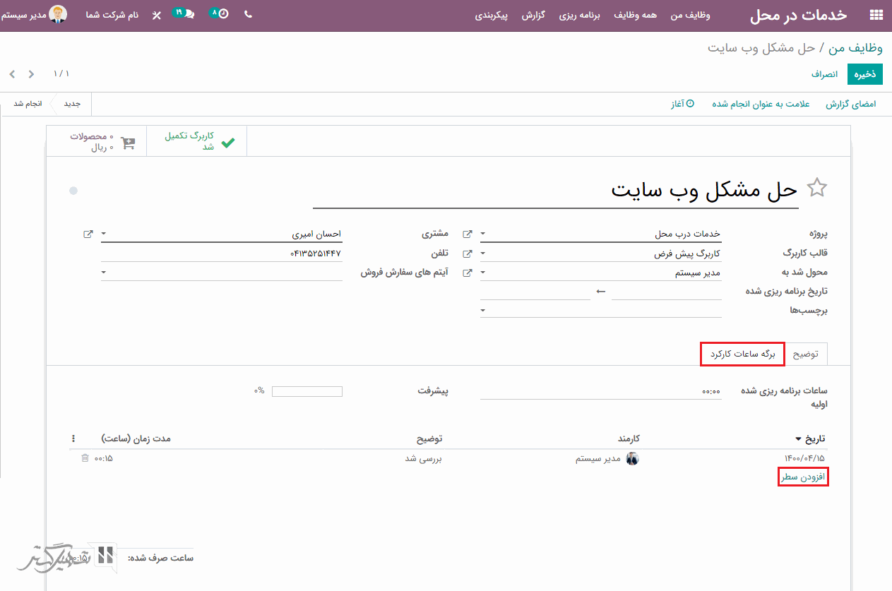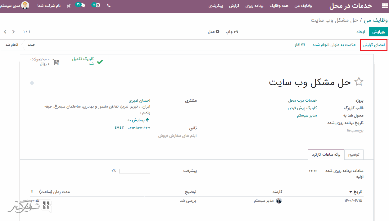 اکنون می توانید در تب برگه ساعات کارکرد ، جزئیات کارهایی که انجام داده اید وارد کرده و تغییرات را ذخیره نمایید. هنگامی که کارمند کاربرگ را امضا کرد، مشتری نیز می تواند گزارش را امضا کند.