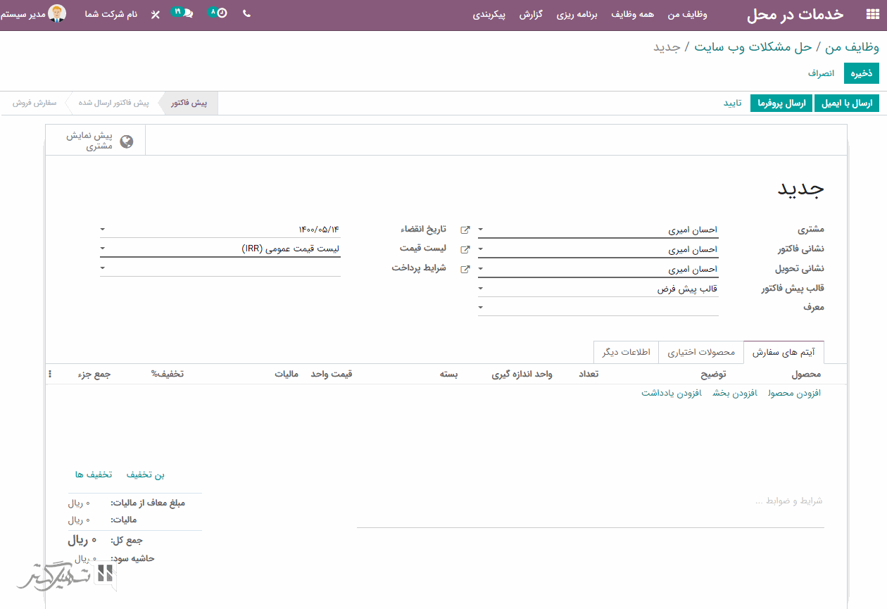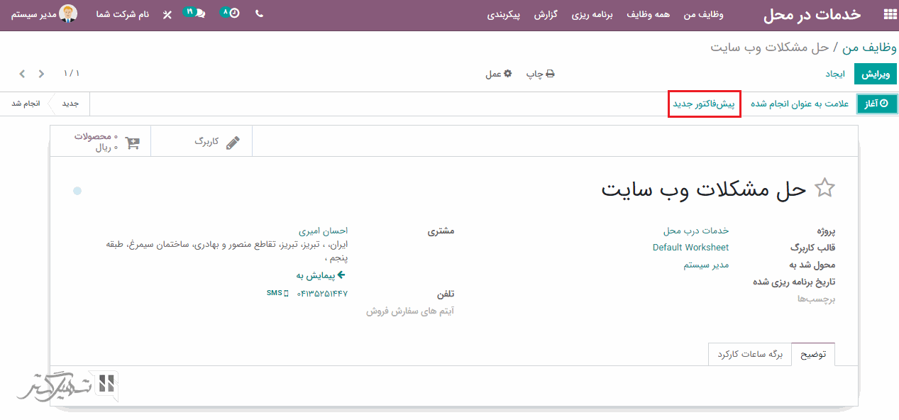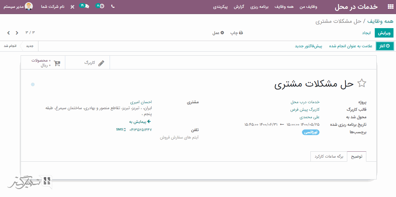 گاها مشتریان برای تعمیرات یا خدمات پس از فروش، خدمات در محل درخواست می کنند. به ماژول خدمات در محل بروید و یک وظیفه جدید ایجاد کنید. در فرم ایجاد، نام وظیفه، پروژه ای که این وظیفه متعلق به آن است، مشتری، تاریخ برنامه ریزی شده را اضافه کرده و سپس تغییرات را ذخیره نمایید.