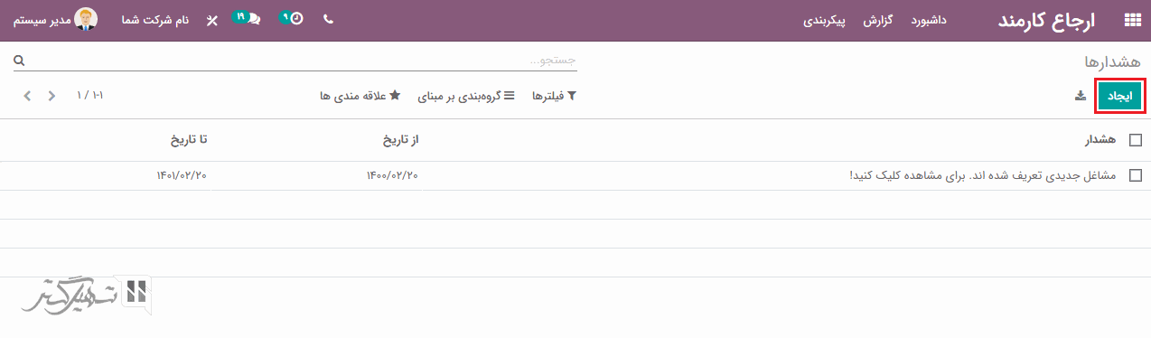 برای اجرای این امر، به ماژول ارجاع کارمند > پیکربندی> هشدارها بروید و بر روی دکمه "ایجاد" کلیک کنید. در فرم ایجاد می توانید تصمیم بگیرید این هشدار چگونه در داشبورد هر کارمند نمایش داده شود: