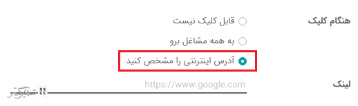 و اگر بر اساس "آدرس اینترنتی را مشخص کنید" انتخاب شود، یک فیلد اضافی با عنوان "لینک " برای افزودن آدرس اینترنتی صفحه ظاهر خواهد شد. به طوری که وقتی یک کاربر بر روی پیام هشدار کلیک کند، به آدرس اینترنتی مشخص شده هدایت خواهد شد:
