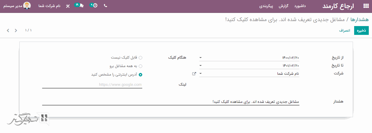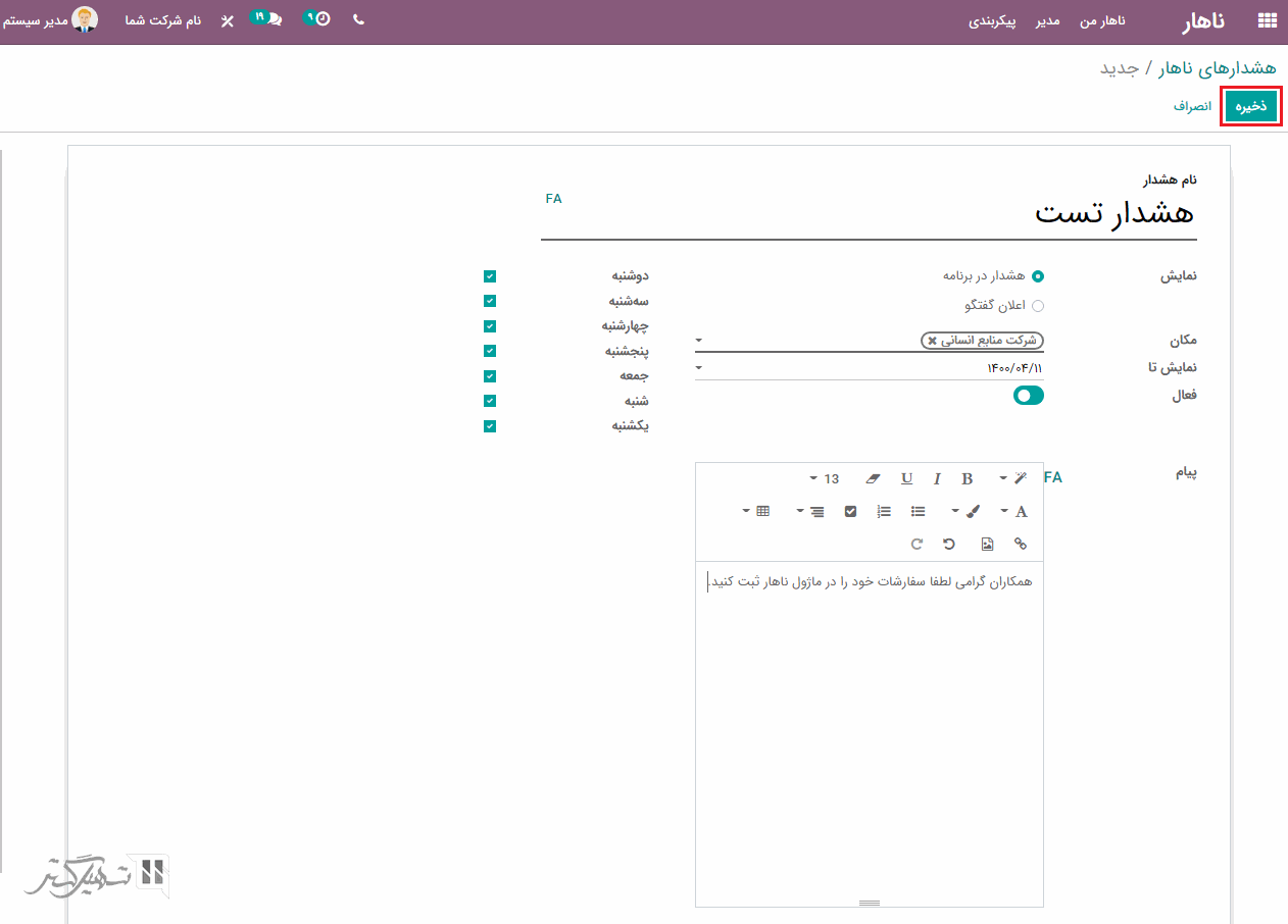 در فرم ایجاد، می توانید نوع نمایش را بر اساس ( هشدار در برنامه یا اعلان گفتگو ) انتخاب نمایید. علاوه بر این فیلدهای مکان، یک پیام هشدار در فیلد پیام، نمایش تا و موارد دیگر را اضافه کرده، سپس بر روی دکمه "ذخیره" کلیک کنید: