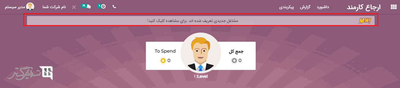 اگر بر اساس "به همه مشاغل برو" انتخاب شود، پیام موجود در داشبور یک پیام قابل کلیک خواهد بود و با کلیک بر روی آن به صفحه موقعیت های شغلی هدایت خواهید شد: