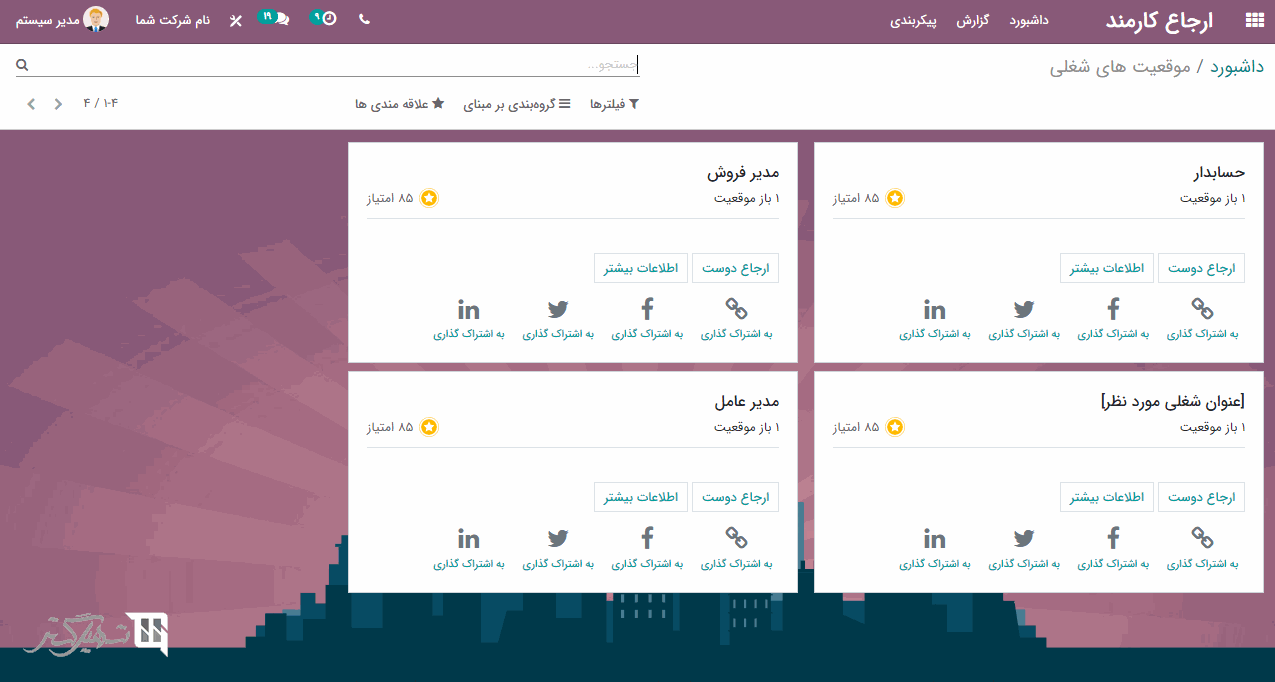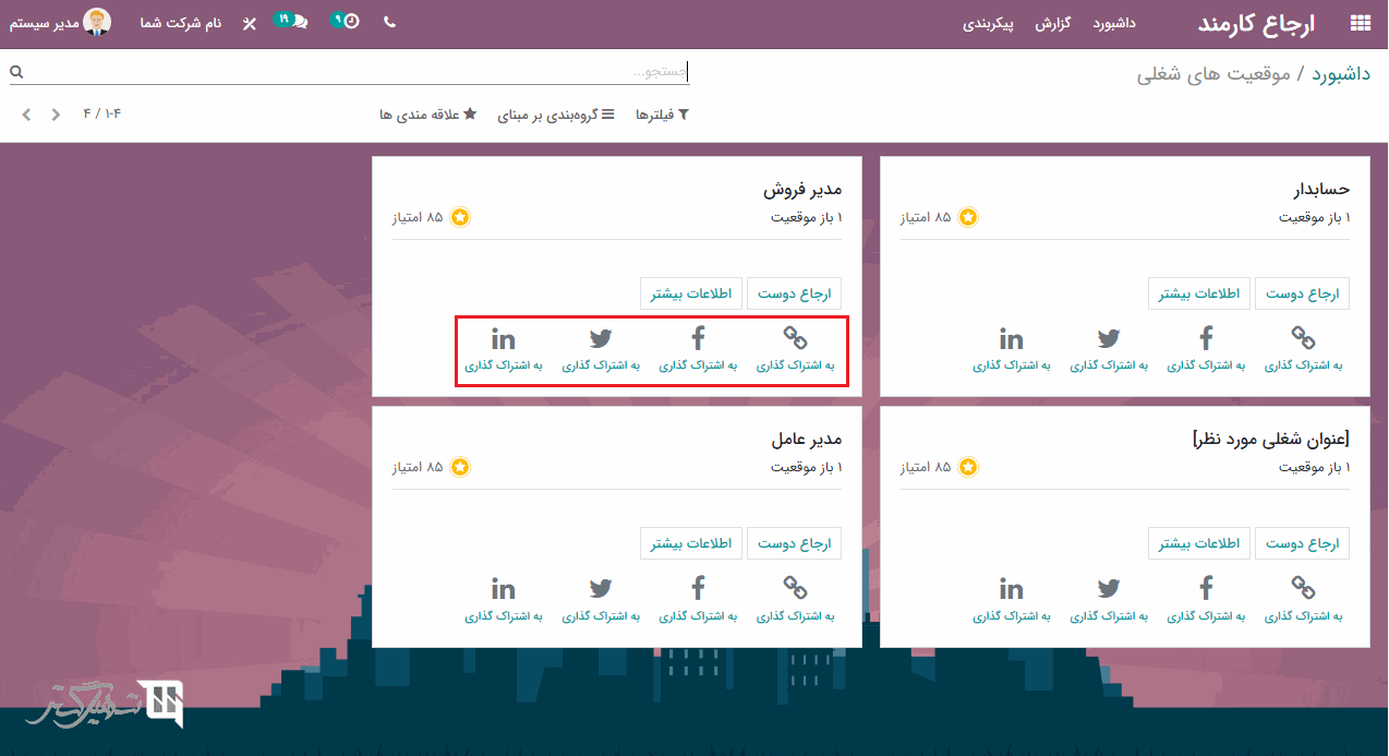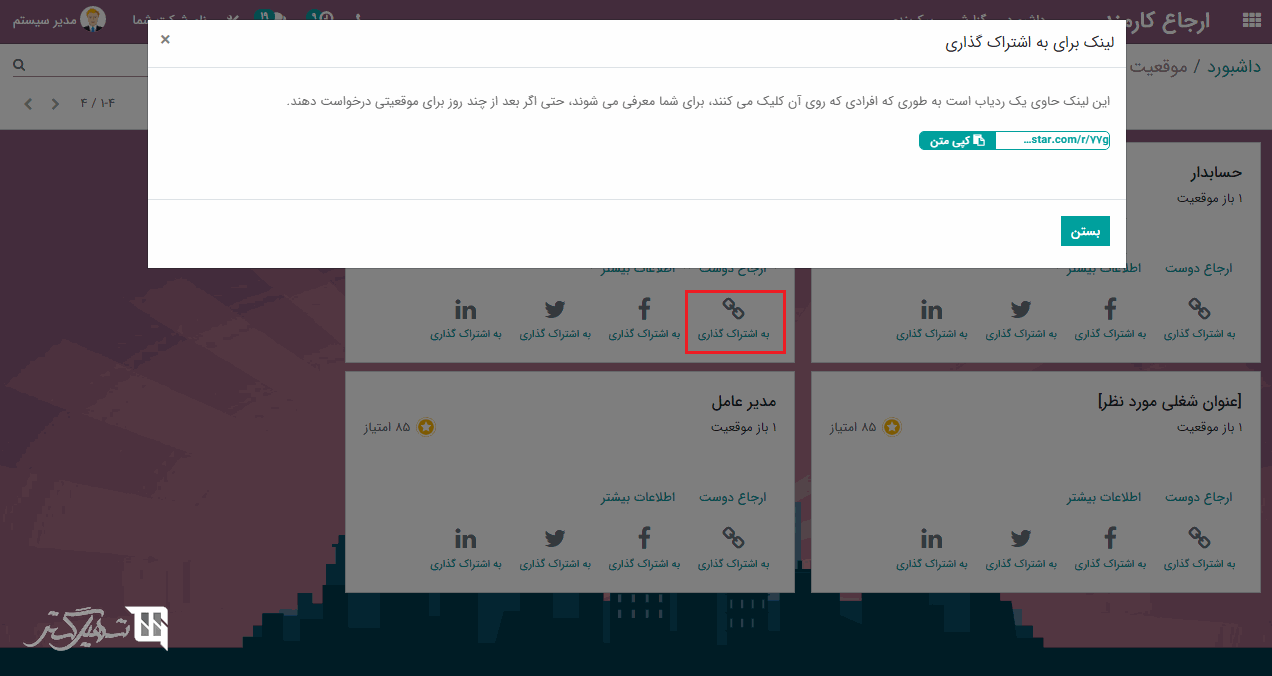 اکنون شما به صفحه موقعیت های شغلی هدایت خواهید شد، در آنجا می توانید موقعیت شغلی مورد نظر را در شبکه های اجتماعی مانند فیس بوک، توئیتر، لینکدین به اشتراک بگذارید: