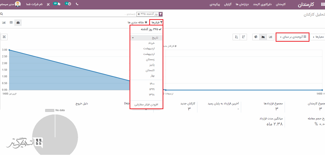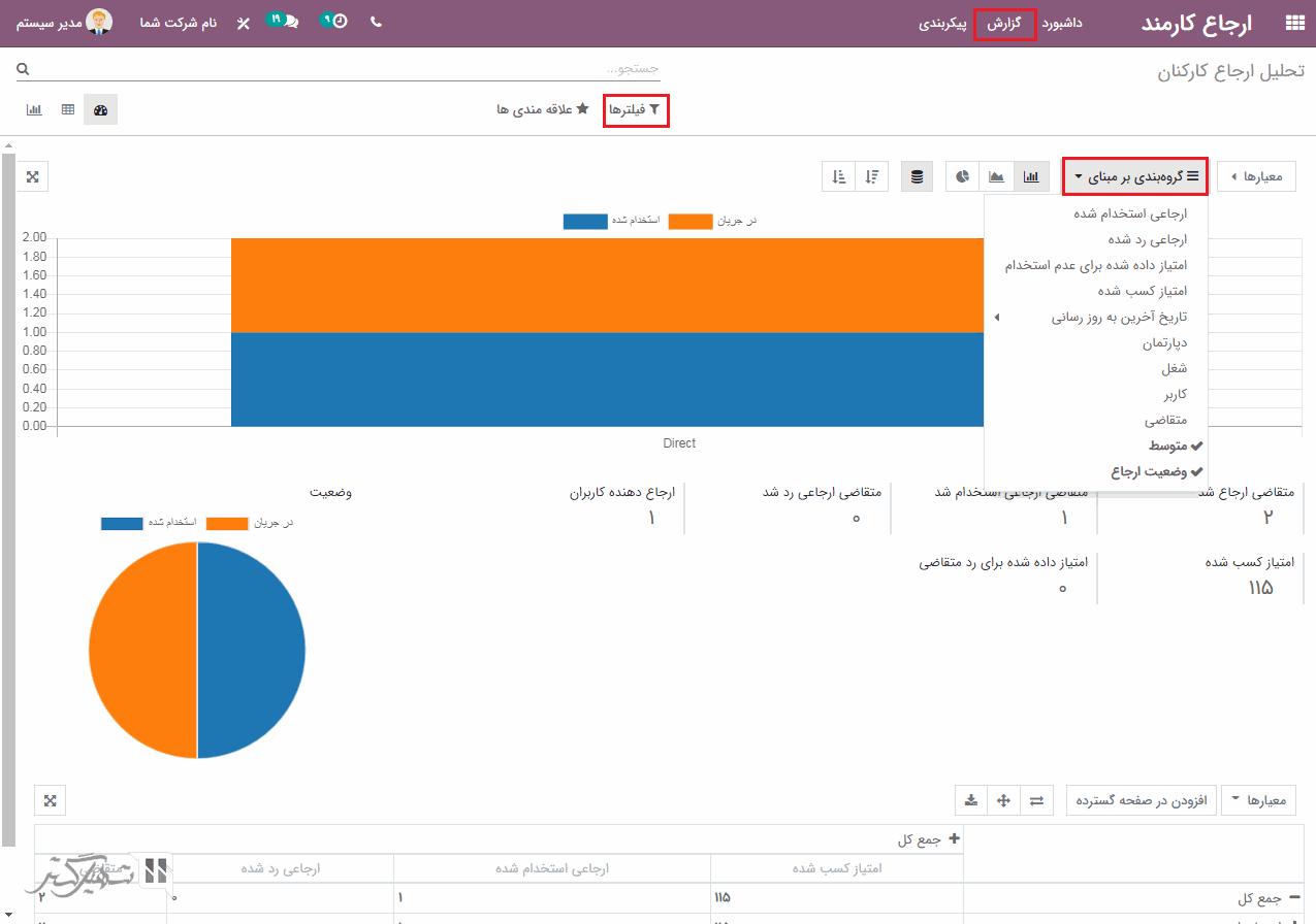 از طریق ماژول ارجاع کارمند> گزارش ، می توانید تحلیل ارجاع کارمند را مشاهده کنید. همچنین می توانید با استفاده از گزینه های "گروه بندی بر مبنای" و "فیلترها" ، کاربران را بر اساس امتیاز کسب شده، ارجاعی رد شده، تعداد متقاضی، ارجاعی استخدام شده و غیره فیلتر کنید و یا گزارش های پویا ایجاد نمایید: