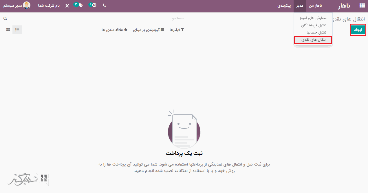 برای انتقال پول نقدی به حساب کارمندان، به ماژول ناهار > مدیر> انتقال های نقدی ب روید و بر روی دکمه "ایجاد" کلیک کنید: