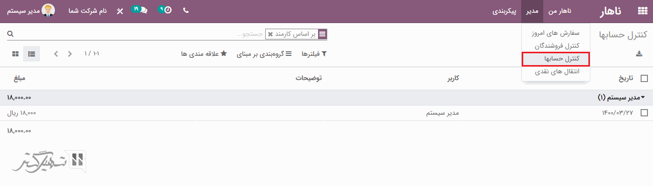 اکنون این مبلغ به حساب کاربری اضافه خواهد شد و شما می توانید جزئیات مبلغ اضافه شده را از طریق ماژول ناهار> مدیر> کنترل حسابها مشاهده نمایید: