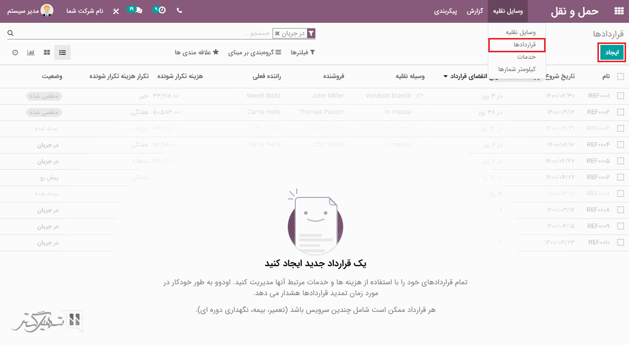 برای ایجاد قراردادهای جدید، به ماژول حمل نقل> وسایل نقیله> قراردادها بروید و بر روی دکمه "ایجاد" کلیک نمایید: