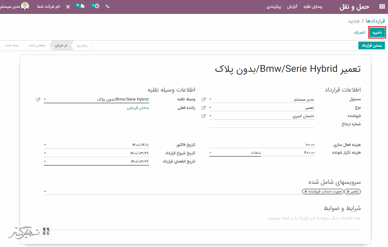 در فرم ایجاد، جزئیات قرارداد مانند نام شخص مسئول، نوع قرارداد، فروشنده، هزینه فعال سازی، هزینه تکرار شونده و اطلاعات مربوط به خودرو مانند وسیله نقلیه، راننده فعلی، تاریخ فاکتور، تاریخ شروع، انقضای قرارداد و غیره را اضافه کرده، سپس بر روی دکمه "ذخیره" کلیک کنید: