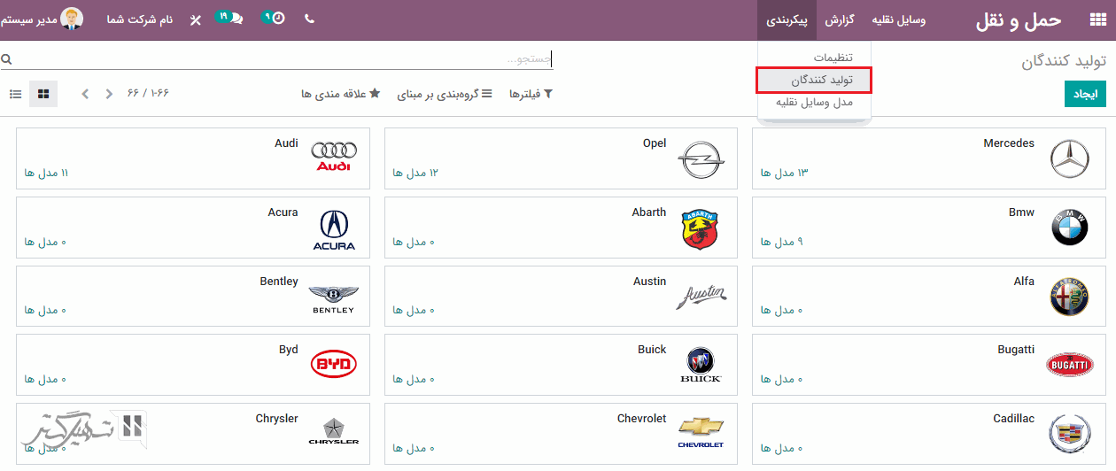همچنین می توانید تولید کنندگان جدیدی را از طریق ماژول حمل و نقل> پیکربندی> تولید کنندگان> کلیک بر روی دکمه "ایجاد" ، ایجادکنید و یا از طریق لیست کشویی از موارد موجود، استفاده نمایید.