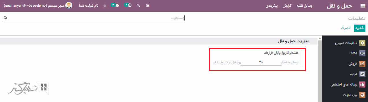 هشدار تاریخ پایان قرارداد را می توانید از طریق ماژول حمل و نقل> پیکربندی> تنظیمات> تب مدیریت حمل و نقل ، اضافه نمایید. در فیلد مشخص شده، تعداد روزهایی که هشدار باید قبل از آن ارسال شود، اضافه کرده، سپس بر روی دکمه "ذخیره" کلیک نمایید: