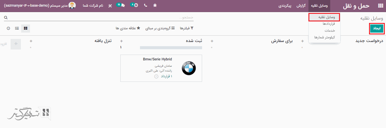 وسایل نقیله جدید را می توانید از طریق ماژول حمل و نقل> وسایل نقلیه > وسایل نقلیه> کلیک بر روی دکمه "ایجاد" ، اضافه کنید: