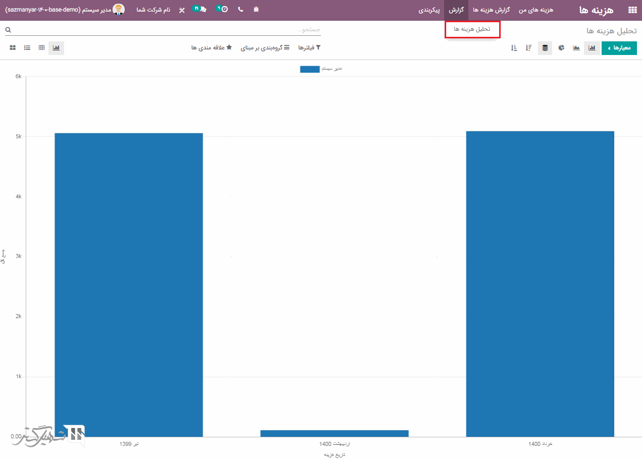 گزارش هزینه های کارمند را می توانید از طریق ماژول هزینه> گزارش> تحلیل هزینه ها مشاهده کنید: