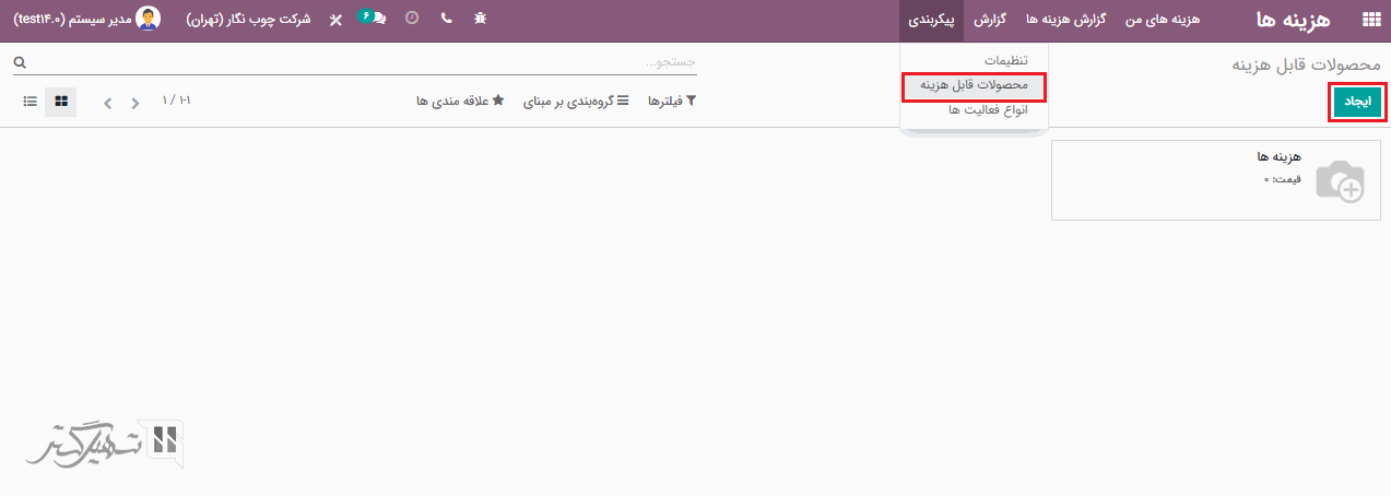 برای پیکربندی محصولات قابل هزینه، به ماژول هزینه ها> پیکربندی> محصولات قابل هزینه بروید و بر روی دکمه "ایجاد" کلیک کنید: