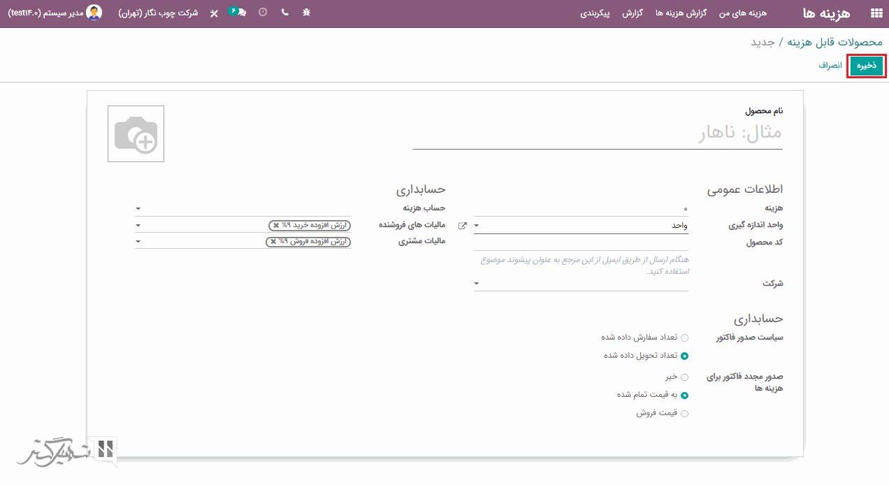 در فرم ایجاد نام محصول، هزینه، کد محصول، سیاست صدور فاکتور، صدور فاکتور برای هزینه ها، مالیات های فروشنده، مالیات مشتری و حساب هزینه را اضافه کرده سپس بر روی دکمه "ذخیره" کلیک کنید: