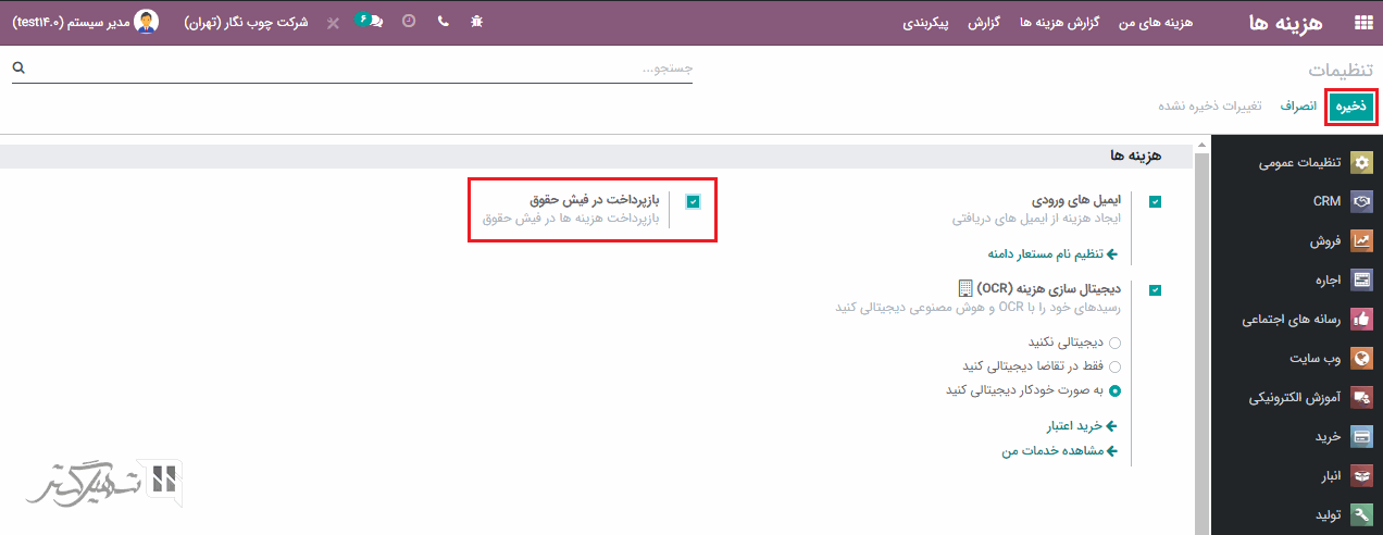 برای بازپرداخت هزینه ها، ابتدا ویژگی "بازپرداخت در فیش حقوق" را از طریق ماژول هزینه ها> پیکربندی> تنظیمات فعال کرده و بر روی دکمه "ذخیره" کلیک کنید: