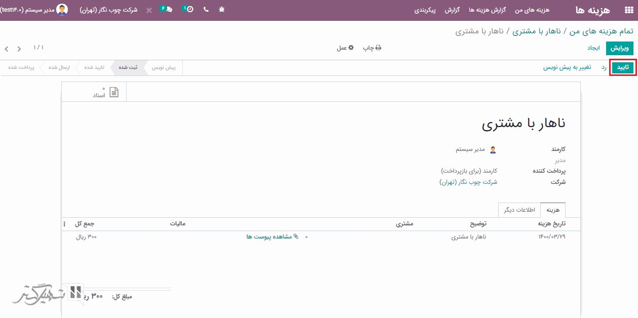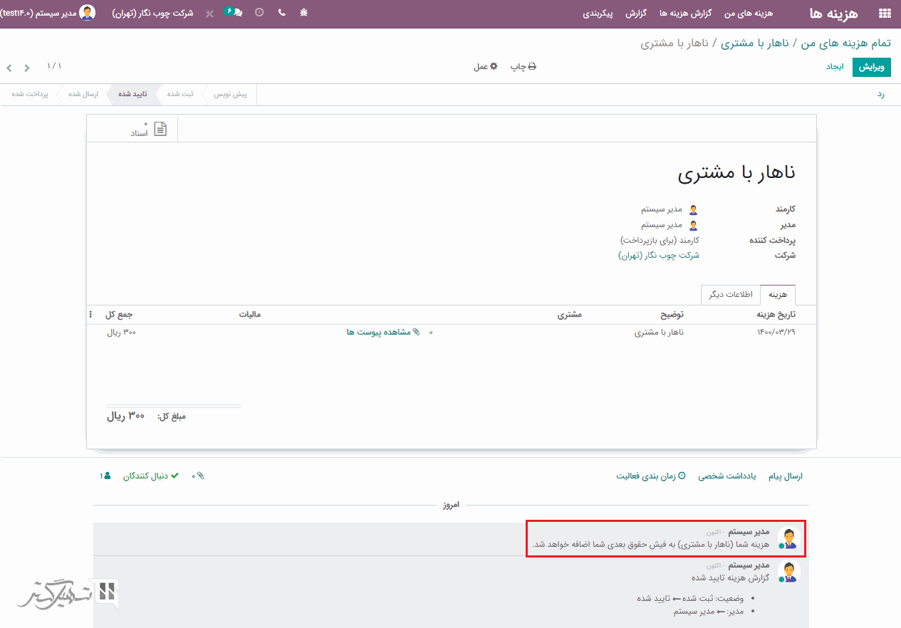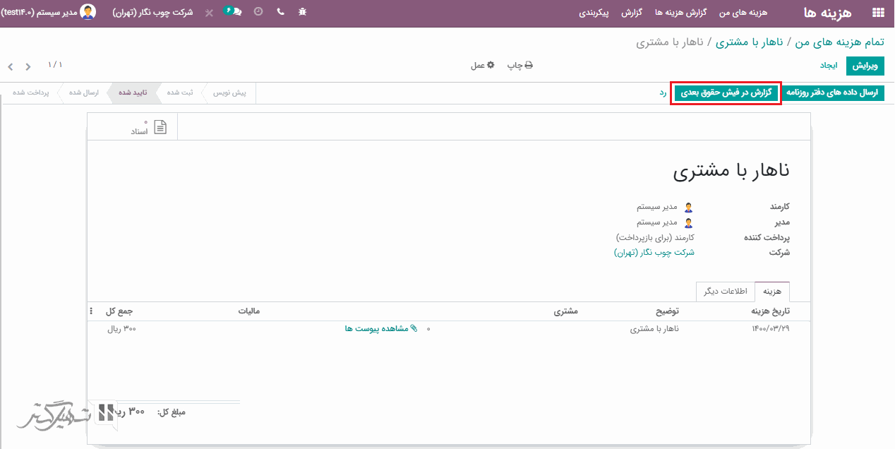 بعد از تایید هزینه، یک دکمه با عنوان "گزارش در فیش حقوق بعدی" در صفحه ظاهر خواهد شد. با کلیک بر روی آن، هزینه به فیش حقوق بعدی اضافه خواهد شد: