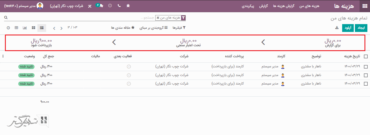 در نمای کلی ماژول هزینه ها، وضعیت هزینه برای گزارش، تحت اعتبار سنجی و بازپرداخت قابل مشاهده است: