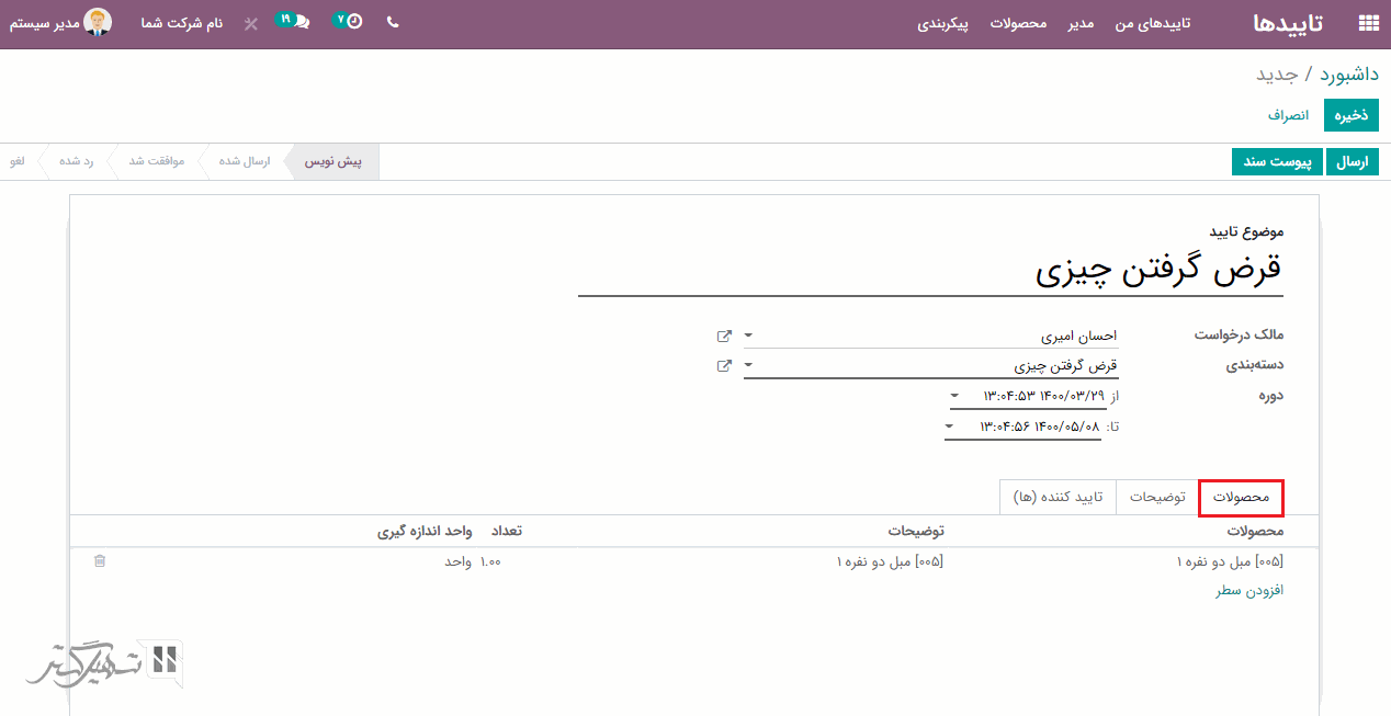 در تب محصولات ، محصول مربوطه و تعدادی که درخواست تایید برای آن لازم است را اضافه کنید: