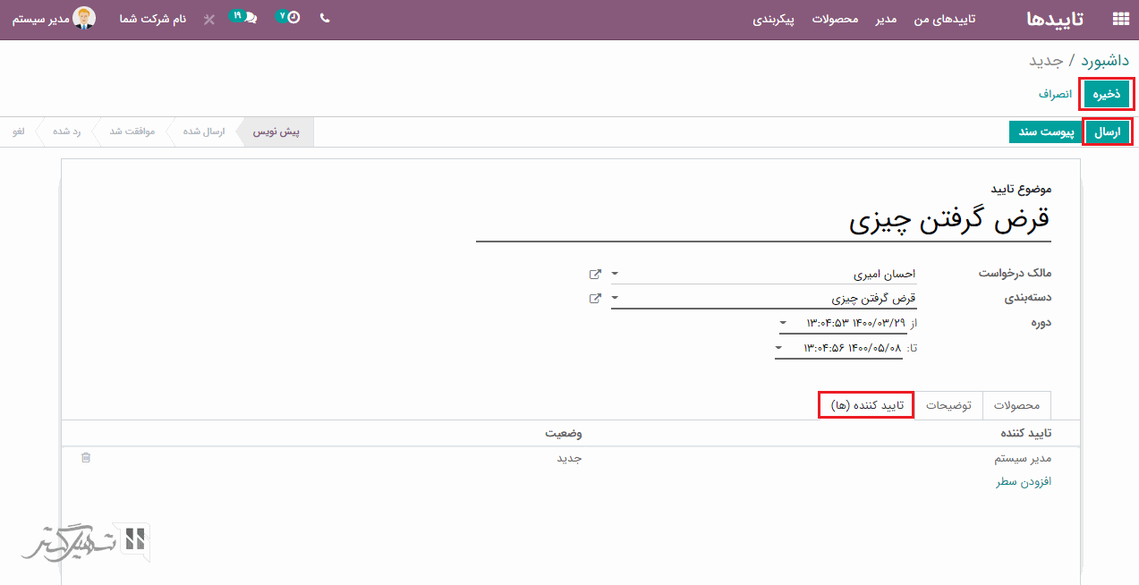 علاوه بر این، در تب تایید کننده (ها) ، می توانید تاییدکنندگان را اضافه کنید، افراد اضافه شده باید درخواست ها را تایید کنند.