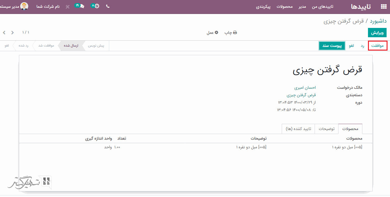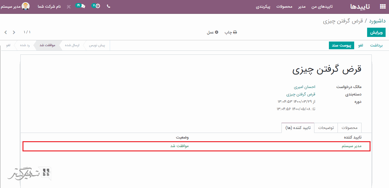 اکنون اگر از بین تاییدکنندگانی که اضافه کرده اید، درخواست را با کلیک بر روی دکمه "موافقت" تایید کنند، وضعیت در خواست به "موافقت شد" تغییر خواهد یافت: