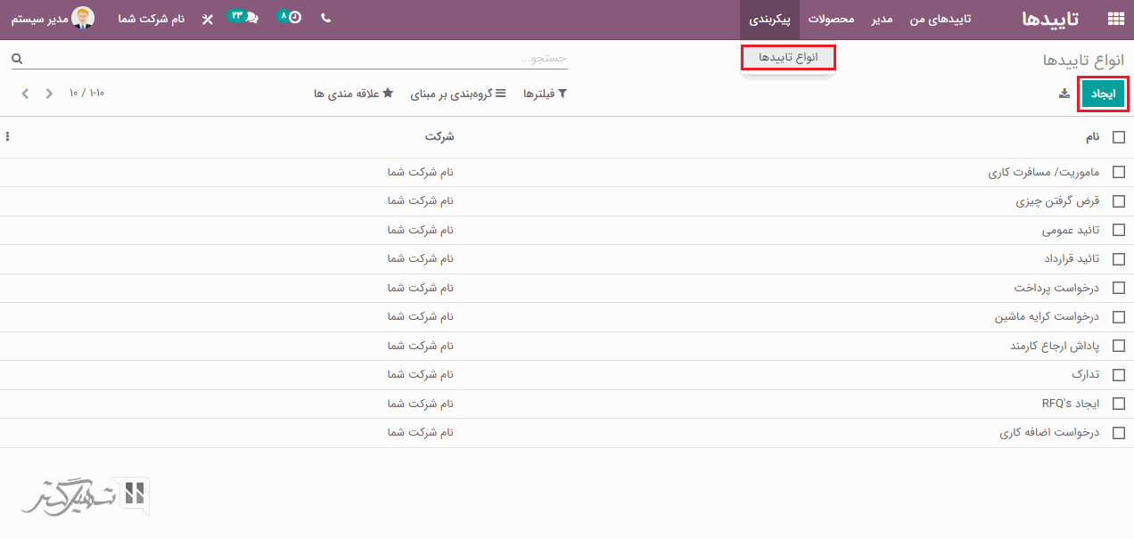 برای این کار ابتدا به ماژول تاییدها> پیکربندی> انواع تاییدها بروید و بر روی دکمه "ایجاد" کلیک کنید: