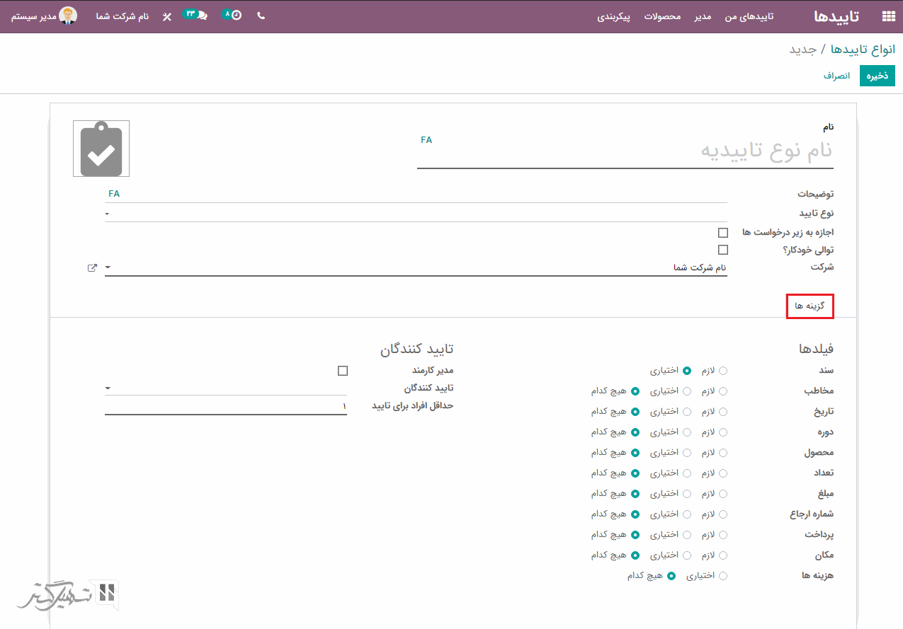 در فرم ایجاد نام، نوع تایید، شرکت را اضافه کنید، همچنین در تب گزینه ها می توانید موارد اختیاری مورد نیاز مانند دوره، محصول، مبلغ، پرداخت، شماره ارجاع و غیره را که می خواهید در فرم ظاهر شود، انتخاب نمایید.