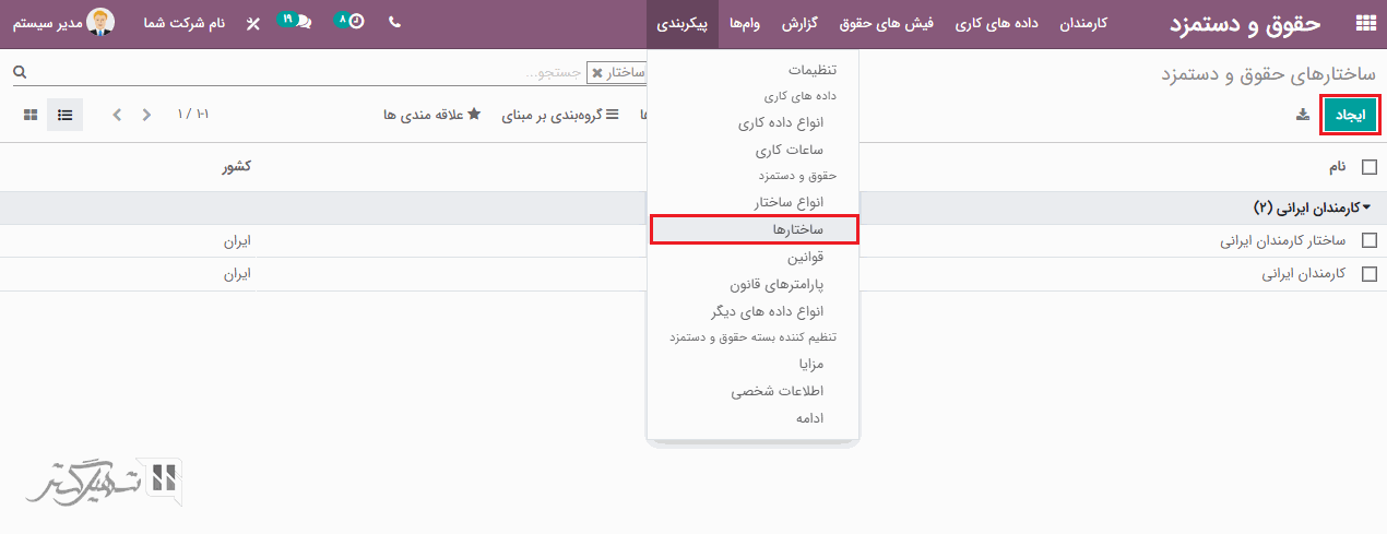 به ماژول حقوق و دستمزد > پیکربندی> ساختارها بروید. در اینجا می توانید با کلیک بر روی دکمه "ایجاد" یک ساختار حقوق و دستمزد برای کارمندان عادی و قراردادی ایجاد کنید.