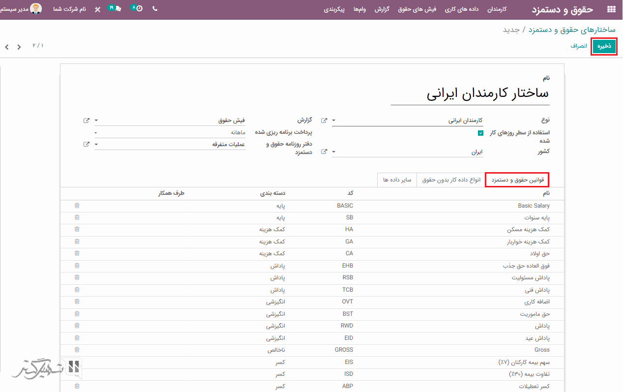 در تب قوانین حقوق و دستمزد ، قوانینی مانند پایه سنوات،کمک هزینه مسکن و موارد دیگر را برای کارمند اضافه نمایید سپس بر روی دکمه "ذخیره" کلیک کنید:
