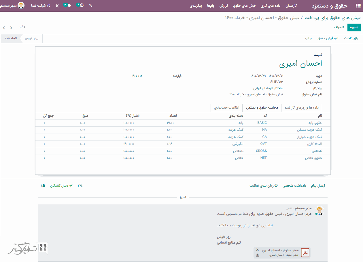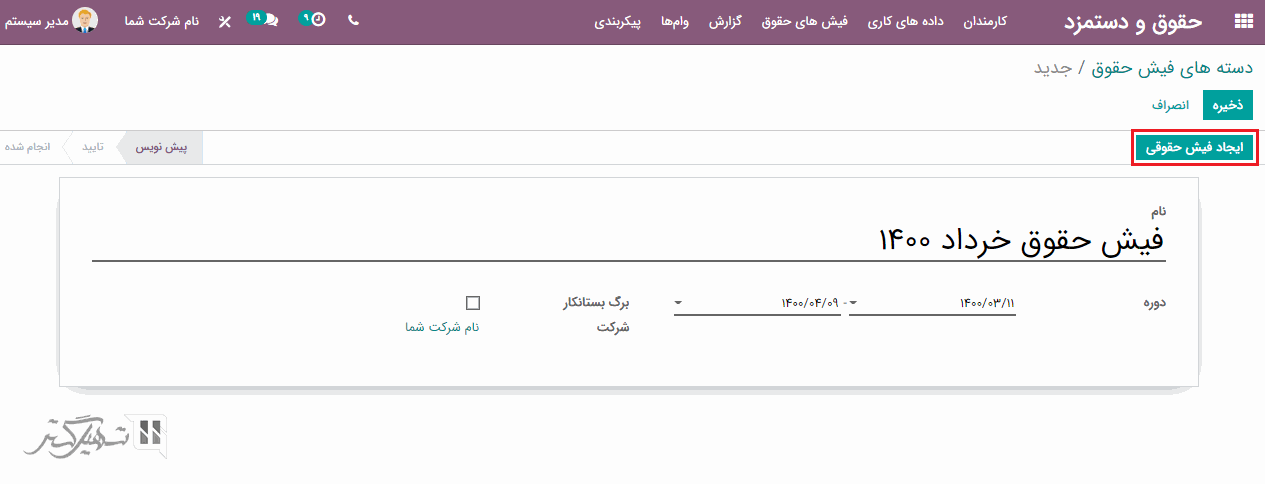 در فرم ایجاد فیلدهای الزامی از جمله نام و دوره را اضافه کرده و بر روی دکمه "ایجاد فیش حقوقی" کلیک کنید:
